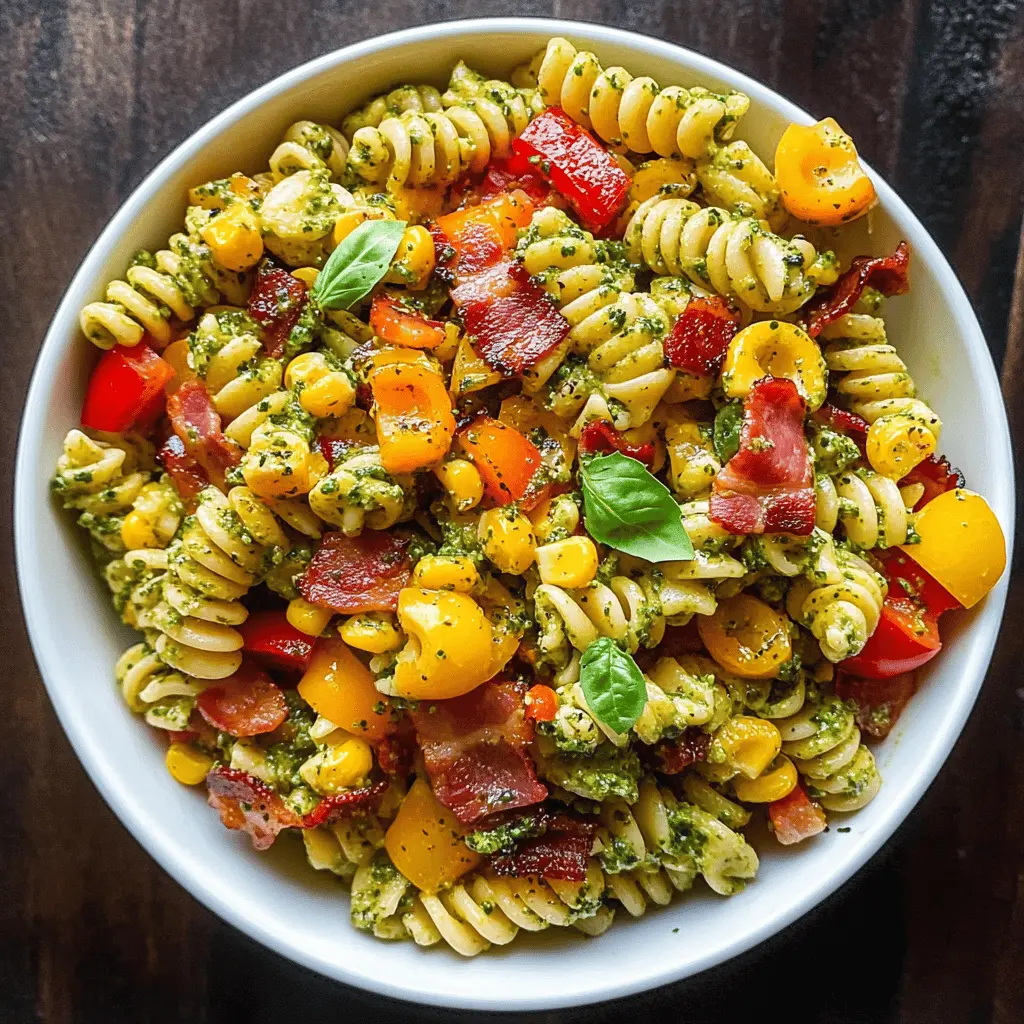 Delicious Corn Pasta Salad With Bacon, Bell Pepper, And Creamy Pesto Dressing
